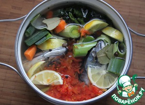 Сложить головы, плавники, хвост в небольшую кастрюлю, добавить стебли сельдерея (у меня - из заморозки) - 2 шт., репчатый лук или лук-порей - 1 шт., жмых от помидор, 1 нарезанную морковь, 0,5 нарезанного дольками лимона, 1 лавровый лист, перец горошком - 5-6 шт., 130 мл сухого белого вина, 1,3 л воды и пару веточек петрушки, если есть.