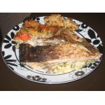 Доску сначала натереть кусочком лимона и разрезать выпотрошенную рыбу на кусочки толщиной по 5-6 см, отделив голову, плавники и хвостики.