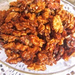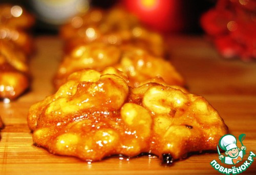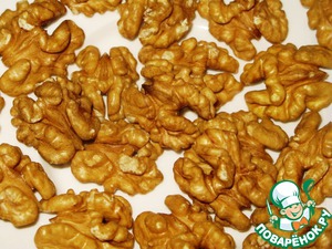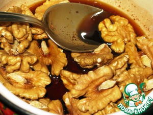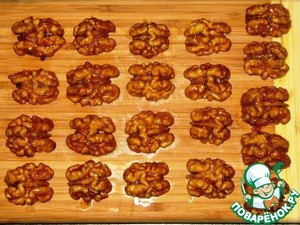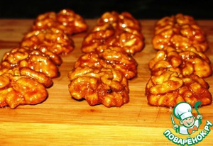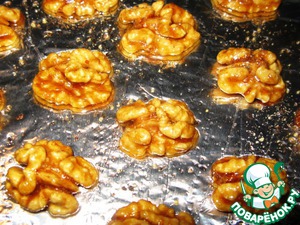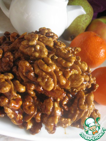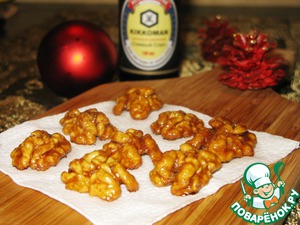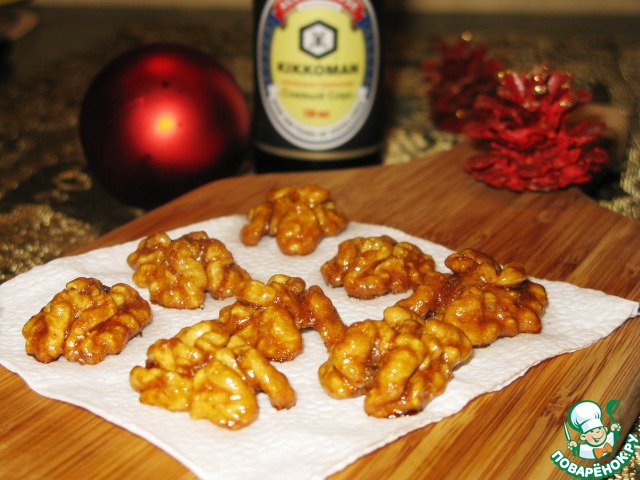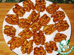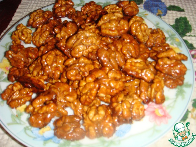 Вы даже не представляете, насколько это вкусно! Это не блюдо, а скорее закуска. Орешки получаются сладко-солёные, чуть остренькие. Хорошо подойдут к шампанскому и вину. Можно украшать такими орешками блюда, салаты. Увидела как-то давно по ТВ, не помню, в какой передаче, такие орешки готовил повар Сергей Кузнецов. С тех пор они прижились у нас. И ни один праздник не обходится без этой закуски.