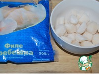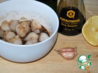 Для этого в гребешок нарезать пластинками чеснок, добавить 3 ст. ложки соевого соуса, выдавить сок половины лимона, добавить оливковое масло и отставить на 30 минут.