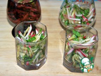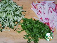 Для этого с помощью тёрки натираем тонкими полосками огурец и редис.