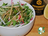 Смешиваем овощи и зелень, сбрызгиваем соком лимона и добавляем 2 ст. ложки соевого соуса.