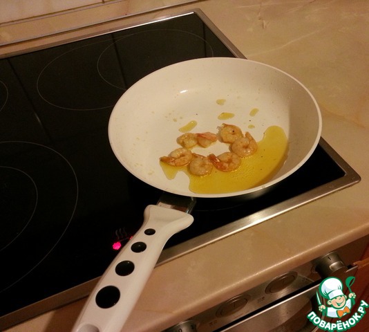 Креветки не жарить, а обжарить нужно полминуты,чтобы они приобрели золотистый оттенок и чесночный аромат. Если их не сварить, то они по сути будут недоготовленные, а если их дольше жарить, то они станут пересушенные и твердые.