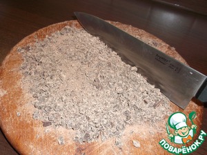 Насколько мелко надо рубить шоколад?По моему я немного"недорубила"и наиболее крупные кусочки опустились на дно,ну а потом при переворачивании оказались сверху,поэтому не делала глазурь .да и есть е эту "мадаму" у меня начали ещё тёплой.