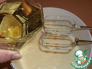 Постепенно в яичную массу вводим подсолнечное масло и ликёр.