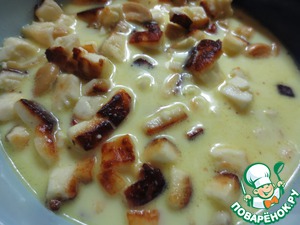 Слегка подогреть молоко, растворить в нём шафран и сахар, добавить изюм с орехами. Дополнить эту массу обжаренным сыром (сырными шариками).