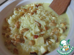 Когда уровень воды сравняется с рисом, добавить смесь молока, изюма и орехов (предварительно вынуть оттуда сырные шарики/кубики; я вынула не все - предпочла, чтобы и в рисе были кусочки сыра).
