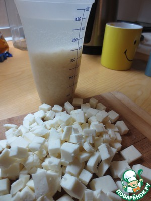 Измельчить адыгейский сыр и сделать из него шарики, либо нарезать кубиками, как показано на фото, впрочем, можно кусочки побольше делать. -