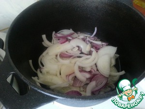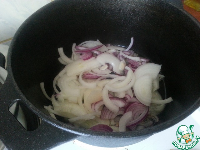 Первое - кладем лук, нарезанный полукольцами (он дольше всех готовится). -