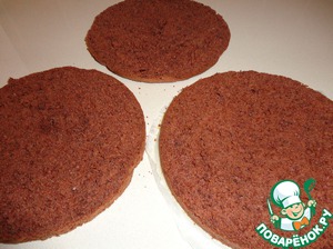 Собираем торт, используя боковую часть формы. Кладем 1 корж, смачиваем его сиропом, сверху 1/2 мусса. Следом 2 корж - сироп - 1/2 мусса. Завершаем 3 коржом, смоченным сиропом. Ставим торт в холодильник. Украсить его можно будет на следующий день.