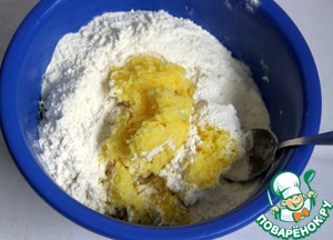 Муку смешать с крахмалом, добавить в неё натёртый картофель и слегка перетереть...
