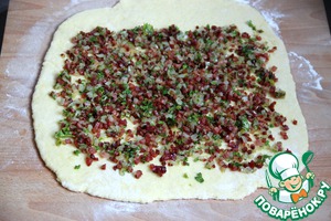 Раскатать тесто (толщиной 1 см) на припорошенной мукой доске. Распределить сверху начинку из шкварок, лука, петрушки...