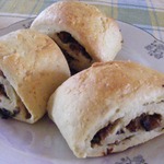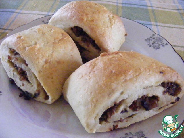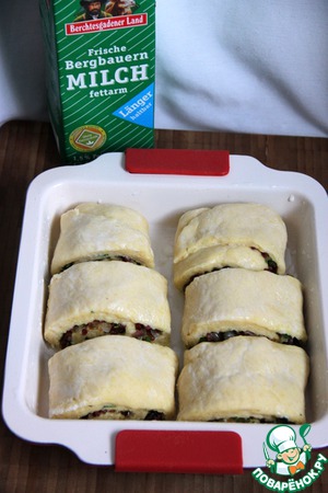 Свернуть рулетом, склеив край молоком/яйцом. Нарезать рулет кусочками толщиной по 5-6 см.