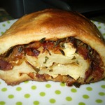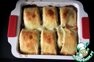 Вместо бекона брала отварную телятину. Порезала ее кусочками и добавила щепотку мускатного ореха в начинку.