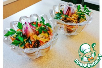 Этот необычный салат я нашла в интернете и решила приготовить его на праздничный стол. Рискнула и не пожалела, так как совершенно все мои гости были приятно удивлены такому сочетанию продуктов, да и попробовать что-то новенькое - это всегда хорошо!!! Рецепт взяли все гости.