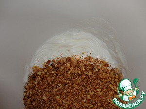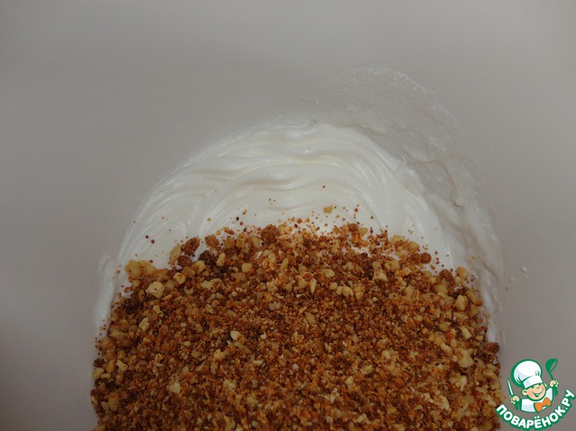 Добавляем в белок смесь орехов с сахаром и перемешиваем ложкой.