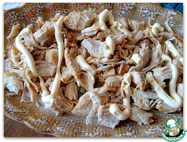 1-й слой - кусочки курицы (половина), майонез (или сметана)