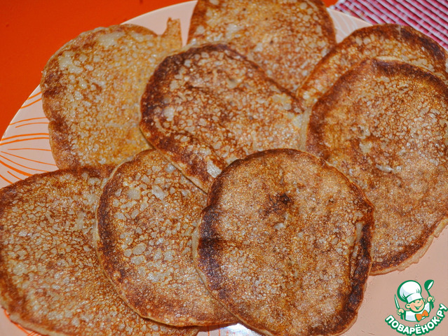 Оставить тесто минимум на 3-4 часа. Я вечером замесила тесто, поставила его в холодильник, а утром выпекала блины на небольшой сковороде. Блины капризные, их нужно жарить на среднем огне, аккуратно переворачивая широкой лопаткой.