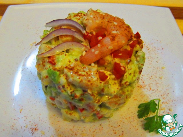 P.S. Если Вы будете ваять эту вкусняшку с крабами, не режьте их, а разделите на волокна. Эти красно-белые ниточки на салатном фоне выглядят просто божественно, а вкус... совсем иной. По правде, мне больше нравится с крабами, но с креветками чаще получается.