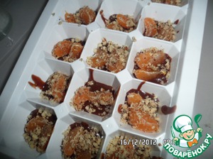 Остальные орехи смешать с оставшимся шоколадом и залить формочки. Поставить наши конфетки в морозилку минут на 15, не больше. За это время они уже схватятся, а мандарин не успеет заморозиться.