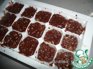 В формочки для льда налить немного шоколада и выложить начинку (мандарины с орешками).