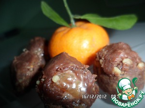 Орехи перемолоть, мандарины очистить и смешать с орехами. Шоколад растопить на водяной бане.