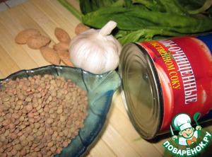 Шпинат вымыть и обсушить. Миндаль поджарить и нарезать на пластинки. Вымытую чечевицу залить бульоном. Добавить туда томаты, лук, чеснок, специи, перемешать, поставить на огонь. Довести до кипения на большом огне, посолить, убавить огонь, накрыть крышкой и варить 25 минут. Измельчить блендером до пюреобразного состояния.
