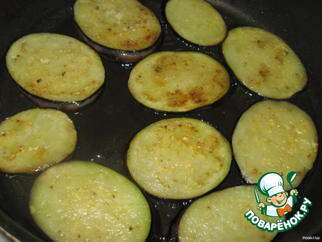• Помидор нарезать кружками. Баклажан также нарезать и обжарить, посолить, отжать и обжарить на растительном масле.