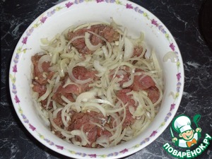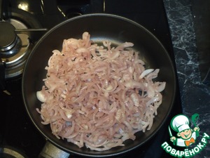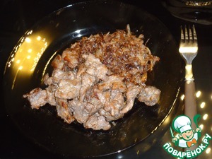 Начинаем готовить мясо, когда лук наполовину готов. Не забываем посолить!