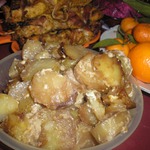 Итак, когда настанет час "Ч", раскладываем картофель на застланный пергаментом противень. Если у нас большая компашка и картофеля больше, то берем два противня. В принципе на указанное количество соевой заливки я готовила и 700 г картофеля, и он тоже помещался на один противень, только плотнее. Т. е. на два противня около 1,5 кг картофеля с двойной "дозой" заливки вполне реально приготовить. Один противень запекаем сразу, а второй ставим в духовку тогда, когда первое блюдо с картофелем уже на столе. Пока уплетается первое блюдо - второе на подходе.