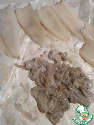Очистить кальмары от плёнки, оставив при этом (если присутствуют) щупальца