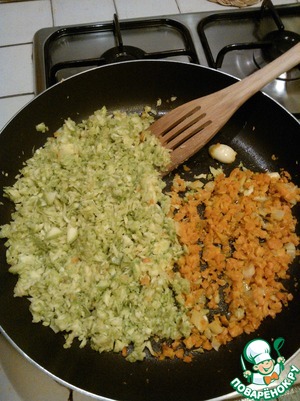 Измельчить в блендере морковь, кабачок и протушить их на растительном масле вместе с зубчиком чеснока до мягкости.