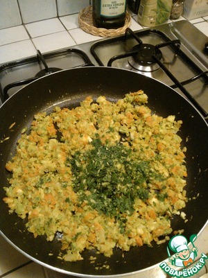 Добавить измельчённую петрушку, посолить-поперчить. Можно также добавить 2 листа измельчённого свежего базилика.