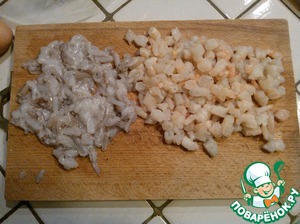 В это время мелко нарезать креветки и щупальца кальмаров (если таковые изначально присутствовали).