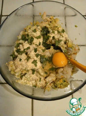 Соединить креветки с овощной смесью, добавить яйцо, измельчённую петрушку, немного соли и перца.