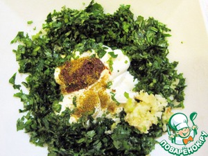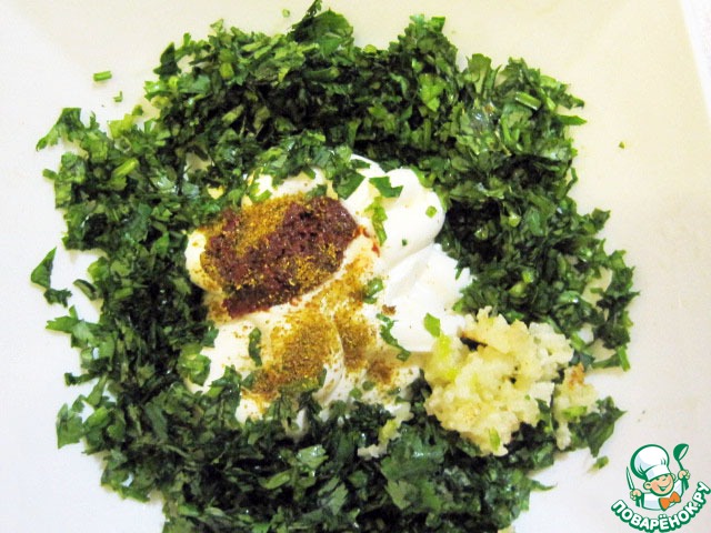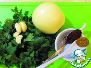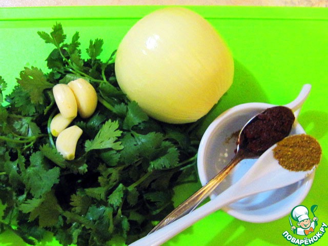 аджику (если нет настоящей, можно молотый острый красный перец), по щепотке соли и хмели-сунели, давленый чеснок, мелкорубленную кинзу. -