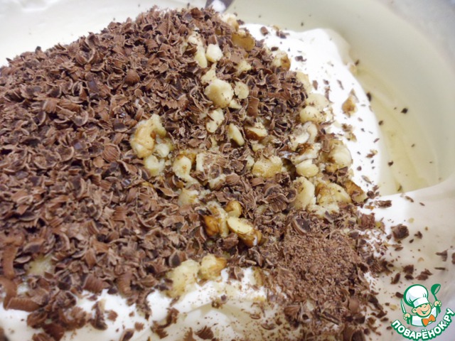 Сливки взбиваем со сгущенкой (не вареной!) и ванилином. Если используете вареную, шоколад больше не нужен - у вас получается мороженое со вкусом крем-брюле. Если, как у меня, то во взбитые со сгущенкой сливки добавляем молотые грецкие орехи и оставшийся шоколад, натертый на мелкой терке. Аккуратно перемешиваем.