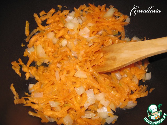 Для этого репчатый лук нарезать кубиками, морковь натереть на крупной терке. Обжарить овощи до мягкости на небольшом количестве растительного масла. -