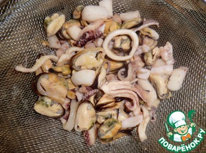 Морепродукты отварить в подсоленной воде, в течение 5 мин, откинуть на сито.