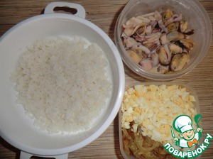 Яйца нарезать кубиками, лук кубиками и обжарить на масле. Смешать все с рисом и морепродуктами.