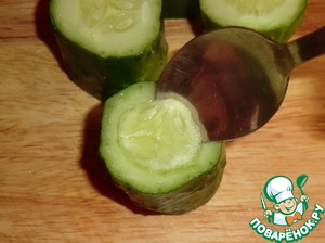 Огурцы вымыть и нарезать на равные по высоте "бочонки," примерно см 4-5, не больше.