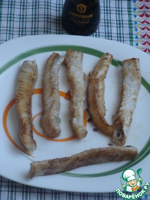 Промаринованную рыбку (филе судака) нарезать тонкими полосками и быстро обжарить.