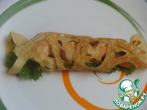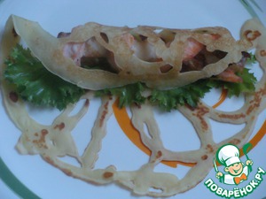 Берем ажурный блинчик, укладываем листья салата и рыбку. -