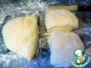 Теперь делим тесто на три части: одна (самая большая) в дальнейшем будет окрашена в зеленый цвет, вторая часть (чуть поменьше) останется белой, ну и самый маленький кусочек станет коричневым.