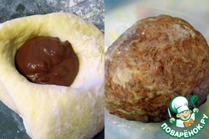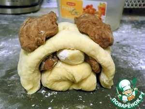 Само тесто довольно обычное, но хлеб получается из него вкусный и сочный. Основная "фишка" этого рецепта в формовке, но до этого еще далеко, а пока займемся тестом. Я доверила эту часть работы своей любимой хлебопечке. Если же вы будете замешивать вручную, то заведите сначала опару (125 мл теплого молока, 1 ст. л. сахара и дрожжи), дождитесь ее вспенивания. Затем добавьте оставшееся молоко, сахар, соль, масло и желток. Муку просейте и замесите тесто. Оставьте на 40-60 минут в теплом месте для поднятия. Я просто выставила режим "тесто" в ХП. Тесто должно подняться в 3-4 раза. У меня маленький первоначальный колобок чуть не убежал из формы. -