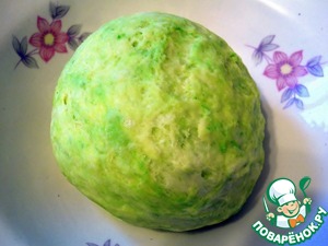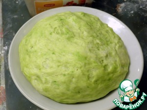 Если у вас краситель сухой (как у меня), то разведите его сначала в воде, а дальше все операции как и с какао. Вот такое по-весеннему зеленое тесто получилось.