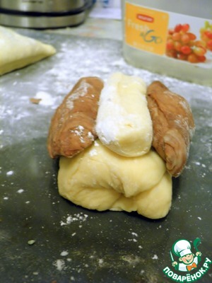 Наконец мы добрались до самого интересного - формирования нашей "панды". Белую часть теста делим на три части: колбаску побольше, колбаску поменьше, третий кусок раскачаем в пласт. Укладываем на стол самую большую белую колбаску. Коричневое тесто делим на 4 части и каждую скатываем колбаской. Две таких колбаски укладываем на белую, как показано на фото. Это будет наша мордочка с глазками.