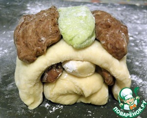 Зеленое тесто делим на две части: маленькую и большую. Маленькую расскатываем в колбаску и укладываем между коричневыми.