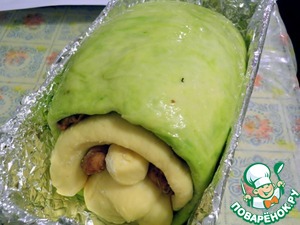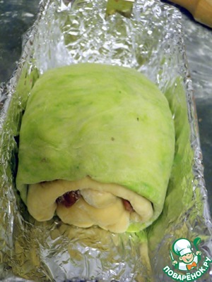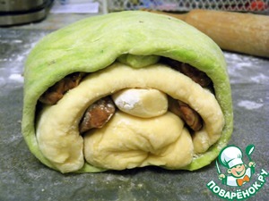 Теперь оставшуюся большую часть зеленого теста тоже раскатываем в пласт и оборачиваем ним все наше сооружение, как сверху, так и снизу.