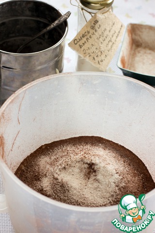 Просеять в миску муку, порошок для выпечки и какао.